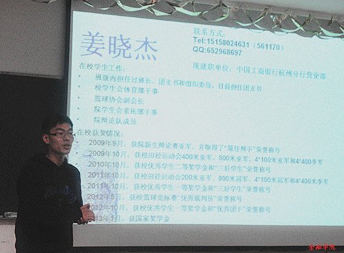 楼202教室准时举行。本次活动有幸邀请到就职于中国建设银行杭州支行、杭州联合银行和中国工商银行杭州支行的余谦学长、叶片翩学姐和姜晓杰学长。他们带着精彩纷呈的求职经历与同学们亲切交流,为同学们的实习就业提供许多宝贵的建议。