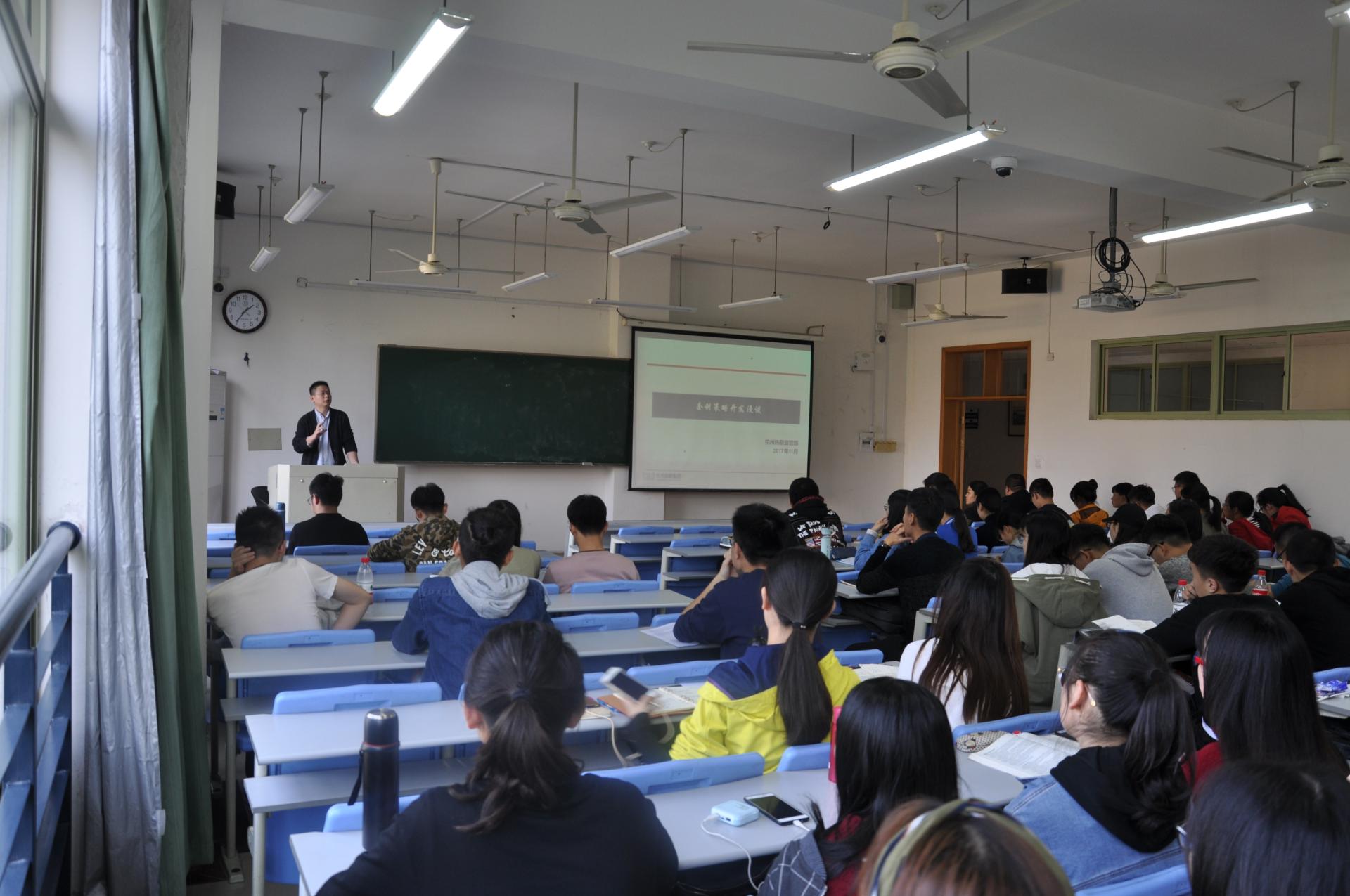 在课堂交流活动中,首先是王浩先生给同学们介绍了在套利策略开发等方面的实践操作案例。其次是邹晓望女士给同学们介绍了杭州热联集团的公司概括,并讲解了热联集团招聘人才的三大原则:学习成绩、社团实践和精神面貌。最后是汤春平先生希望同学们多多地到热联集团参加实践锻炼。