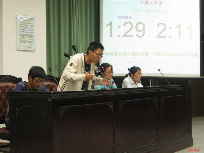 经过一月多月的激烈比拼,最终站上决赛舞台的是金2和保险两队,当晚,双方围绕“新闻价值和新闻道德哪个更重要”的辩题展开了激烈的辩论。立论环节中,正方金2队提出新闻道德只是规范新闻的一种手段,新闻价值才是新闻发展的真正动力,据此阐述新闻价值比新闻道德更重要的观点。反方保险队则从新闻应该发挥积极的舆论导向作用入手,从社会责任角度展开反击。接下去的攻辩中,双方列举实例,展开辩驳。其中,反方以那位为了获得新闻照片,眼睁睁地看着非洲女孩生命受秃鹰威胁却没有援助的记者为例,论述“你先是作为一个人存在,然后才是记者”的观点;正方反驳提出这样一张照片能引发公众对那个群体的注意,以“千万人的生命与小女孩的生命,谁轻谁重”阐述己方观点。自由辩论环节中,正方从不真实的报道没有体现真正的新闻价值出发,与反方展开激烈辩驳,几轮精彩的交锋赢得观众阵阵掌声。最后的总结陈词环节中,双方结合现场辩论情况,沉着、冷静地进行了总结和提升。
