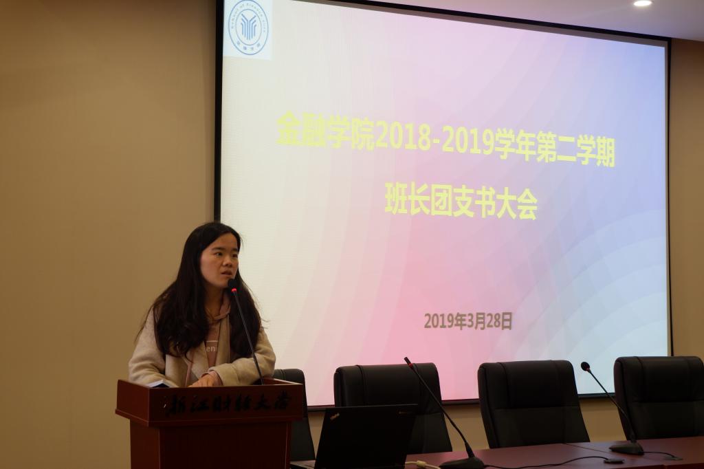 春季接力赛、“纪念‘五四’运动100周年暨浙江财经大学‘青春·追梦’大型歌会”报名、挑战杯竞赛申报、十佳团支部评选、校运动会、特色团小组评选等活动,鼓励同学们积极参与,并提出一系列工作要求。而后,就团员推优入党的要求和程序对大家做了强调,希望各团支书做好规范推优入党工作。
