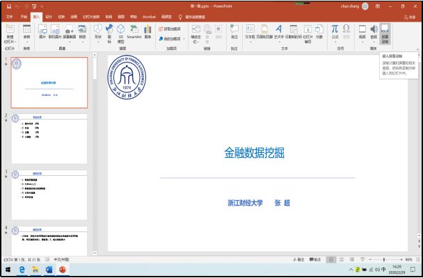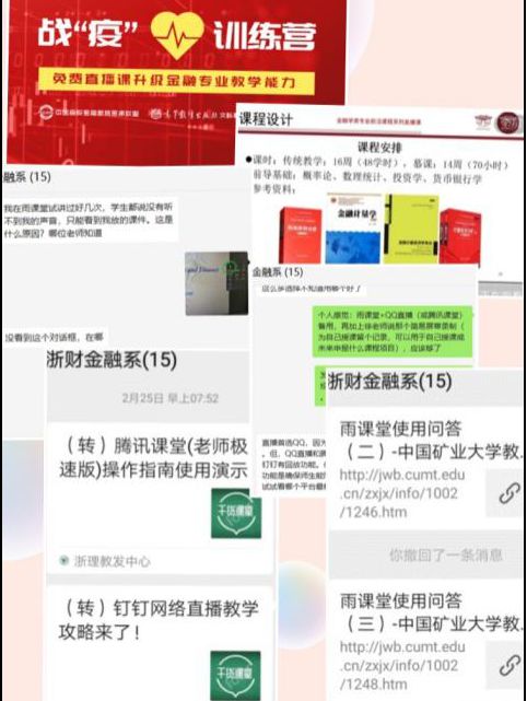 的老师们积极探索,克服困难,进行了多种尝试并及时共享心得。金融工程系的王聪聪教授针对《Investments》课程,总结和共享了“钉钉直播+OneNote”结合的在线教学使用心得。信用管理系的张超副教授针对《金融数据挖掘》实验课程的特点,分享了“雨课堂+QQ课堂+PPT录屏结合”的教学方式。保险与精算系的张代军教授结合《保险经营管理学》就如何用好浙江省高等学校在线开放课程共享平台和老师们进行了细致的分享。投资系的阎晓春副教授分享了“钉钉+《信托与租赁》慕课+雨课堂”的教学方法,其中《信托与租赁》慕课被中南大学、南京审计大学、四川农业大学等多家外省市高校异步或同步引用。金融学系的鲁莹博士针对《国际金融》课程的特点,探索和共享了“省在线平台+腾讯课堂”的在线教学方案。同时,阎老师和鲁老师的这两门课程在刚刚落幕的浙江省本科院校“互联网+教学”优秀案例(线上线下混合课程)的评选中喜获省二等奖,更是为线上教学的开展增添了力量。