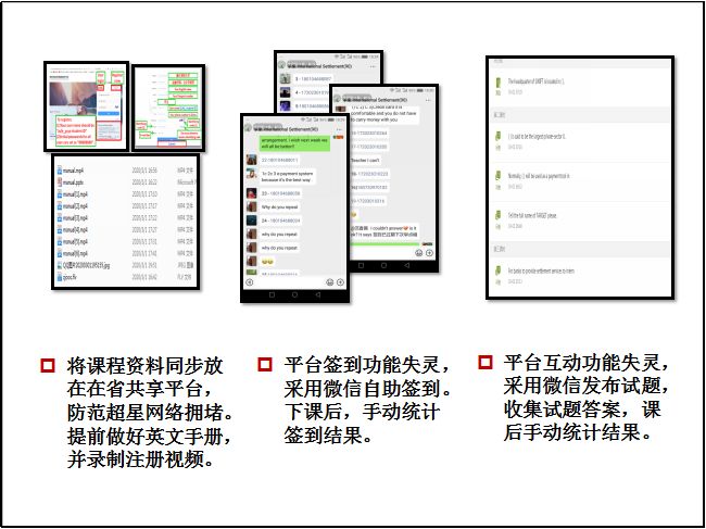 领导班子和教学办公室多次沟通,反复协商,起草出台了多个工作预案。教学管理人员和辅导员紧密合作,及时发布各项信息,并耐心细致做好师生的答疑解惑工作,为在线教学的开展打下了扎实的基础。