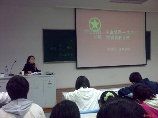 张虹老师先给大家介绍了感恩节的由来和感恩节的意义。之后张老师以一些生动真实的例子,讲述社会上的令人触目惊心的人们不懂感恩的事例,让大家受益匪浅。接着,张老师分析了当代大学生缺乏感恩意识的原因:家庭教育的缺失,学校教育的缺失,社会教育的缺失,社会教育的缺失,学生自我教育的缺失。最后,张老师对所有同学提出殷切的期望,要大家从身边小事做起,学会感恩,特别是要去孝敬自己的父母。要求每一位同学给父母发一条短信,表达对他们的爱,课堂气氛十分活跃。
