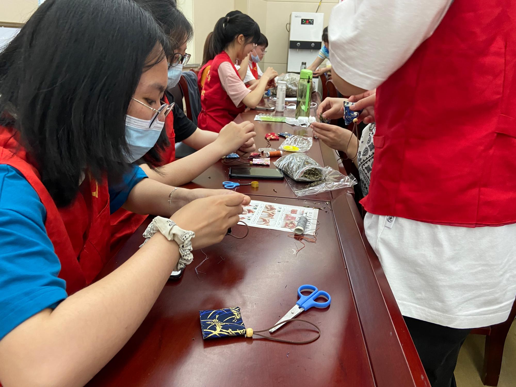 最后,志愿者们和社区居民一起动手制作了艾草香包,让居民们在大家庭的氛围中体验传统民俗的魅力,共同欢度端午佳节。活动中,大家一齐动手各显神通,切艾草、裁剪布料、缝制香囊袋,不一会儿功夫,形状各异的艾草香包就做好了。活动现场欢声笑语、其乐融融。志愿者们把艾草香包送给了社区居民和社区工作人员。