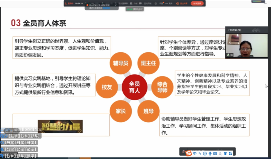 积极贯彻“全员育人”的教育理念,辅导员、班主任、综合导师、家长、班导、校友在学生健康成长中均发挥了重要作用。她还介绍了足球直播线上看