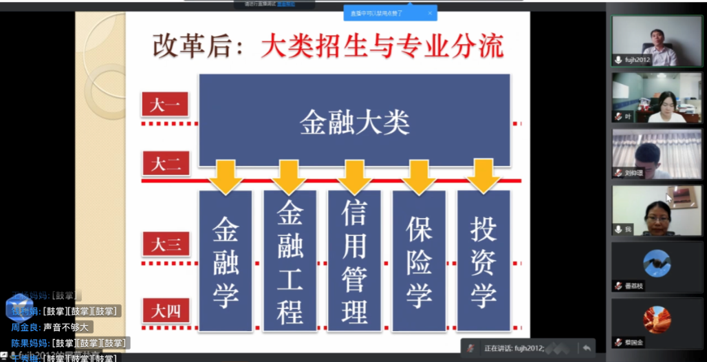 人才培养方案和CFA项目。他向全体新生和家长介绍了改革后的大类招生与专业分流,详细介绍了四年学习生涯的课程规划与大类专业特色,强调了在校期间绩点的重要性,并从“终身学习意识”、“身体锻炼意识”、“职业底线意识”三个意识,特色鲜明地阐述了足球直播线上看