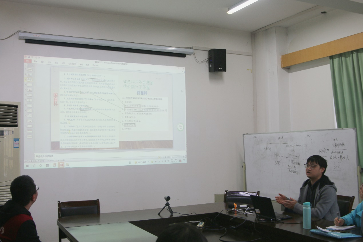 在本次经验分享会中,张硕楠博士从省自科与国自科的对比出发,重点讲解了两者在申请材料、审查流程、评审结果、学科分类等方面上的区别,同时介绍了申请省自科对于国自科的有利之处。对比之后,张硕楠博士以自身省自科申请书为例,就关键科学问题的选择方向、项目标题关键词选择、研究工作科学意义的侧重方向、项目与长期研究目标的关系等方面进行了介绍,引起在场教师热烈讨论。最后,张硕楠博士基于自身申请经历,阐释了申请过程中可能遇到的部分细节问题。