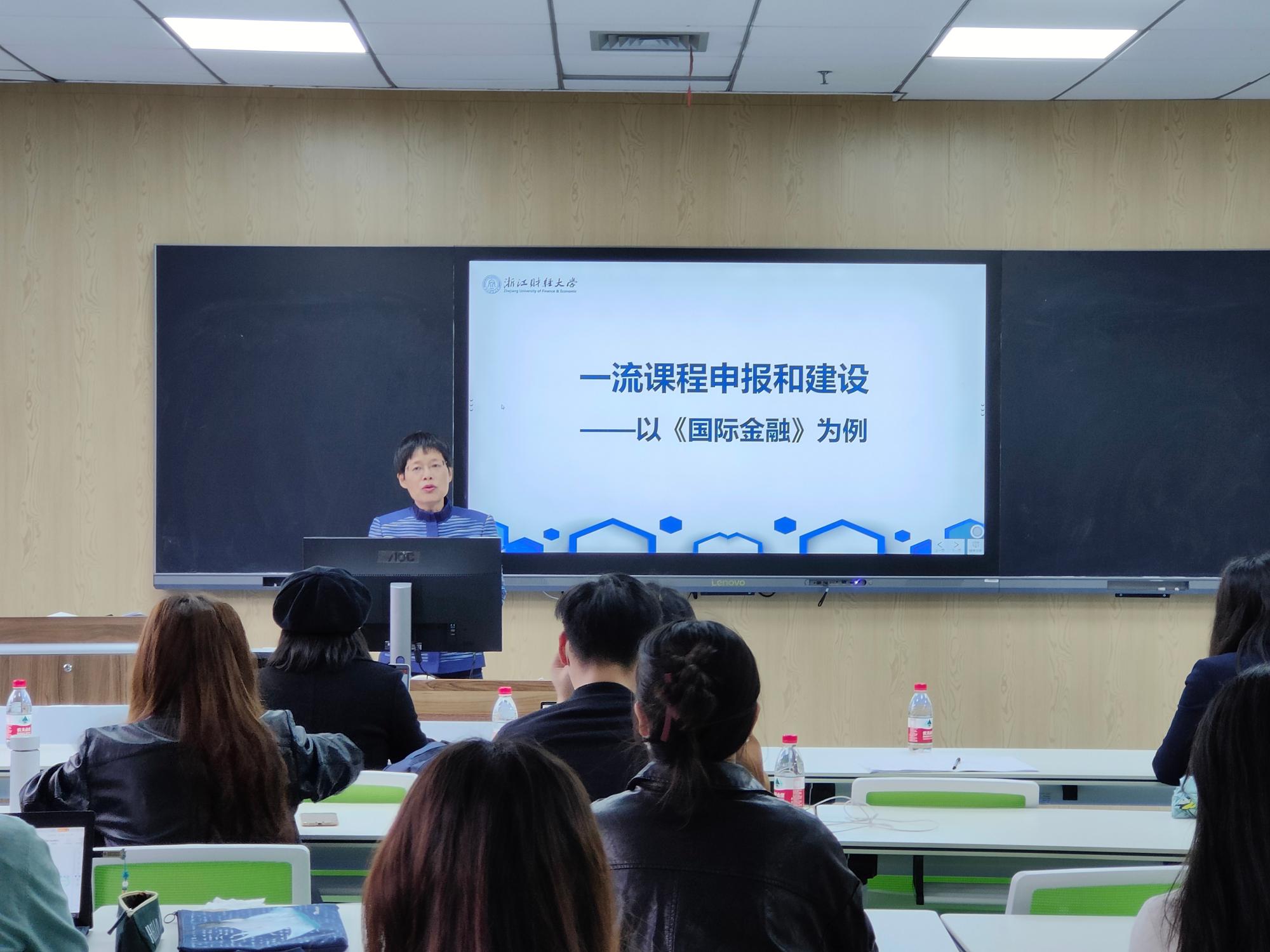 浙江省师德先进个人、浙江省线上线下混合式一流课程负责人徐敏老师,以“一流课程的申报与建设—以《国际金融》为例”为主题,从课程基本信息、课程教学团队、课程目标、课程建设及应用、课程特色与创新和课程建设计划等方面进行详细剖析,并结合课程对混合式教学的课时鉴定、所申报课程的学校和专业定位、所授课程在教学视角及课程体系的设计等问题进行着重说明和分享。