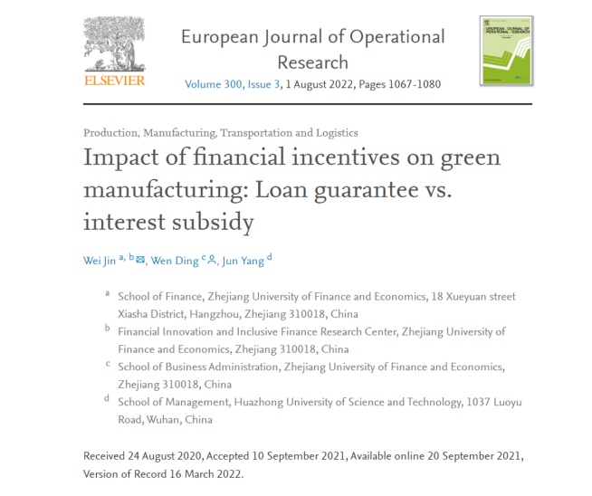 )、杨珺教授(华中科技大学)的论文“Impact of financial incentives on green manufacturing: Loan guarantee vs. interest subsidy”在国际权威期刊《European Journal of Operational Research》第300卷(2022年)第3期正式发表。该期刊被SCI一区检索,为ABS4星级、FMS A类期刊。论文链接://doi.org/10.1016/j.ejor.2021.09.011