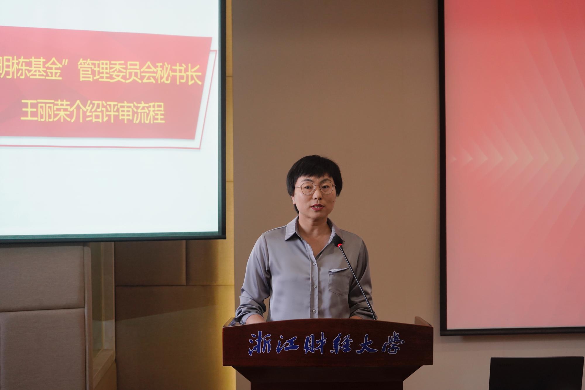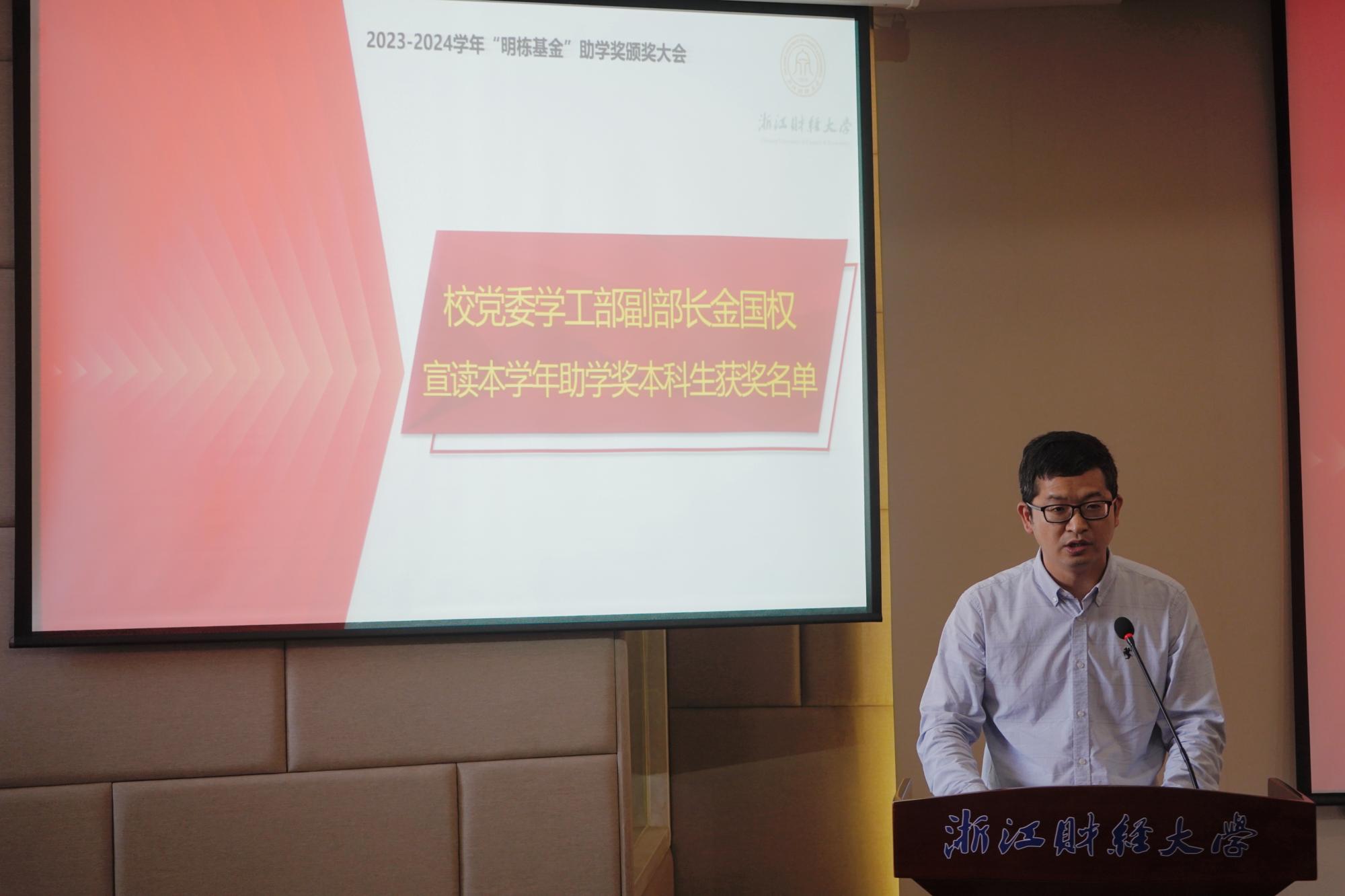 “明栋基金”管理委员会秘书长王丽荣向大家介绍此次“明栋基金”助学奖的评审流程。校党委学工部副部长金国权、校党委研工部副部长林剑分别宣读2023-2024学年“明栋基金”助学奖本科生、研究生获奖名单。“明栋基金”管理委员会主任楼栋和秘书长王丽荣为获奖学生颁奖。