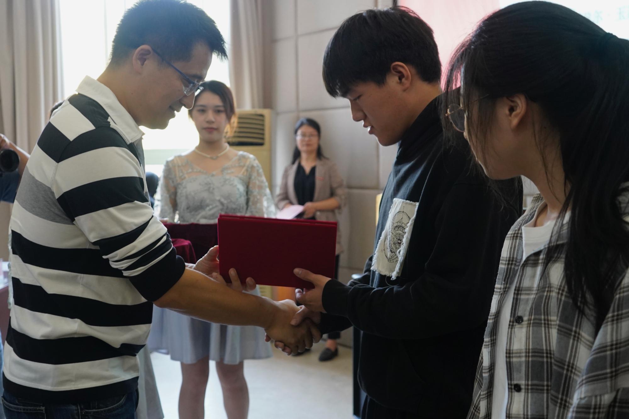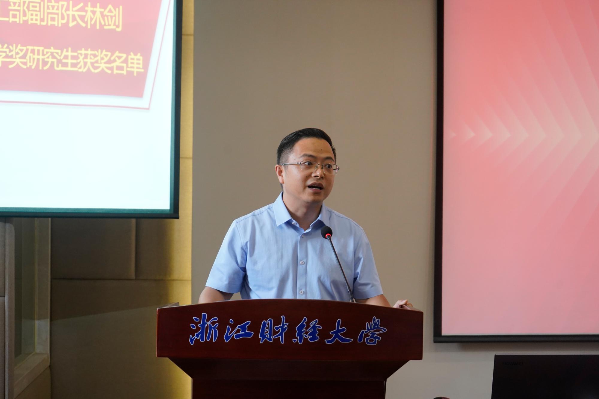 随后,“明栋基金”捐赠方代表、浙江盈阳资产管理股份有限公司创始人楼栋讲话。他首先祝贺获奖学生,勉励青年学子在未来的学习中能够不断突破自我,励志成长,完成从“面对问题的人”到“解决问题的人”的身份转变。他提到,希望能进一步深化企校合作,鼓励学子们到企业参观学习。最后,他叮嘱同学们要有时代先锋的意识,争创下一个“明栋基金”。