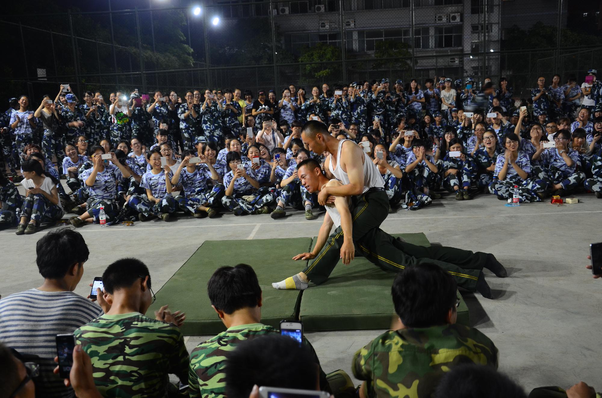 当然,教官的表演才真正地将现场气氛推向了高潮。模拟搏斗术、日常训练项目、双人对抗……逼真的实战场面,激烈的对抗技术,展示了作为军人的英勇和无畏,也为新生们树立了良好的榜样。作为晚会的压轴节目,教官和学生同台表演的神曲舞蹈《小苹果》轻松而搞笑,同学们也看到了教官可爱的一面,军民的情谊也深深地凝结在一起。