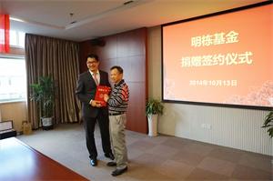 会上,学校领导代表学校感谢王晓明、楼栋校友的慷慨捐赠,并表示此次捐赠,是向母校40周年校庆的献礼,二位校友既是优秀的金融界人才,又是有责任感的企业家,在母校设立“明栋基金”,支持教育事业发展,回报培育之恩之举,不仅是对母校经济上的支持,更是精神上的鼓舞,是慷慨、大义之举,更是大爱之举,宣扬着正能量。他也希望广大校友能一如既往地支持我校教育事业,不断壮大发展教育基金会。