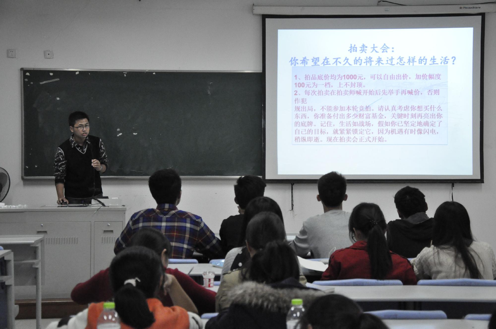 主持人以一段短小而又精湛的开幕词拉开了这次团课的序幕。他向大家介绍了“我的价值观,我的中国梦”以及“社会主义核心价值观”,并联系中共中央总书记习近平同志在十二届全国人大一次会议上的讲话中系统阐述的中国梦思想,引出“价值观、中国梦”主题,以此开展关于“梦想”的主题班会,让同学们在大学生活中明确今后前进方向,拥有前进的动力,有美好的理想及展望。为更进一步促进同学关系发展,主持人让男女同学进行了一个互动游戏“你看我猜”。简单的小游戏迅速让同学们打成一片,原本班级同学之间微小的隔阂也消失殆尽,班级气氛一片和乐。接着,保险班同学举行了“人生价值观拍卖活动”。颇具特色的拍卖让同学们认识到机遇与挑战并存,也让同学们对自己以后的生活有了更加明确的认识。