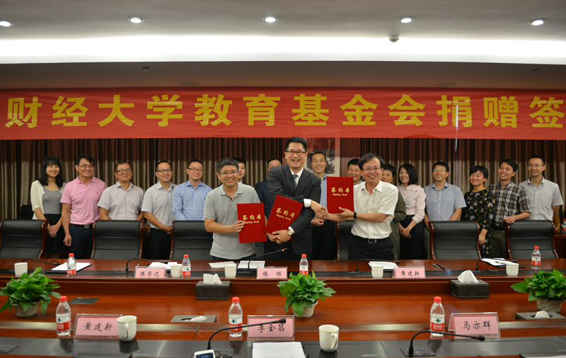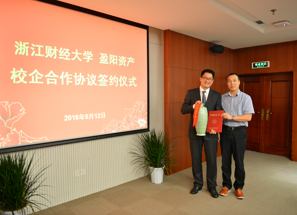 在签约仪式上,楼栋校友、黄建新副校长、陈荣达院长先后签署了《浙江财经大学与盈阳资产校企合作框架协议》和《浙江财经大学与盈阳资产校企合作第一期项目建设协议书》。同时,李金昌书记为楼栋校友颁发了捐赠证书和纪念杯。