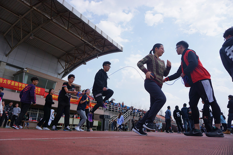 比赛正式拉开帷幕。首先是2分钟长绳接力。飞舞的绳子有力地敲打着塑胶跑道,运动员们一个接着一个地跳过长绳,极少间断,每支队伍的表现都非常出色,赢得场边一阵阵欢呼声。最后16金工1、16保险、16金融3分别获得2分钟长绳接力的第一、二、三名。