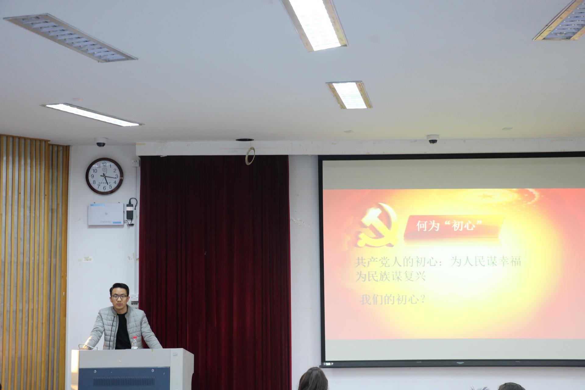 聂亚平老师给大家观看了一期以十九大为主题的《开讲啦》节目,节目中的主讲人谢春涛为同学们深入地解读了十九大后的新时代新征程。视频结束后,聂老师与现场同学进行了关于“初心”的交流互动,令同学们更好地体会了中国共产党的初心。