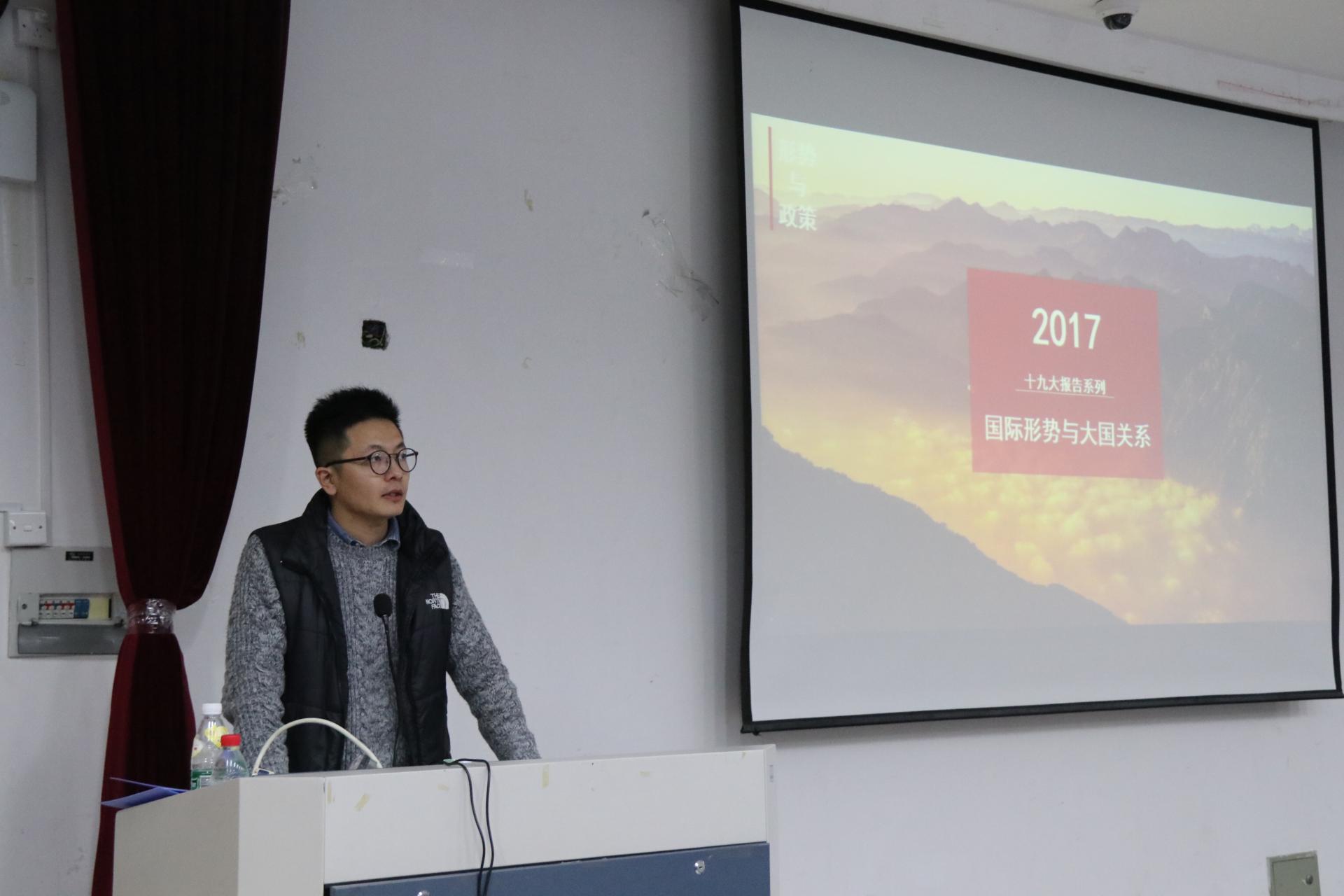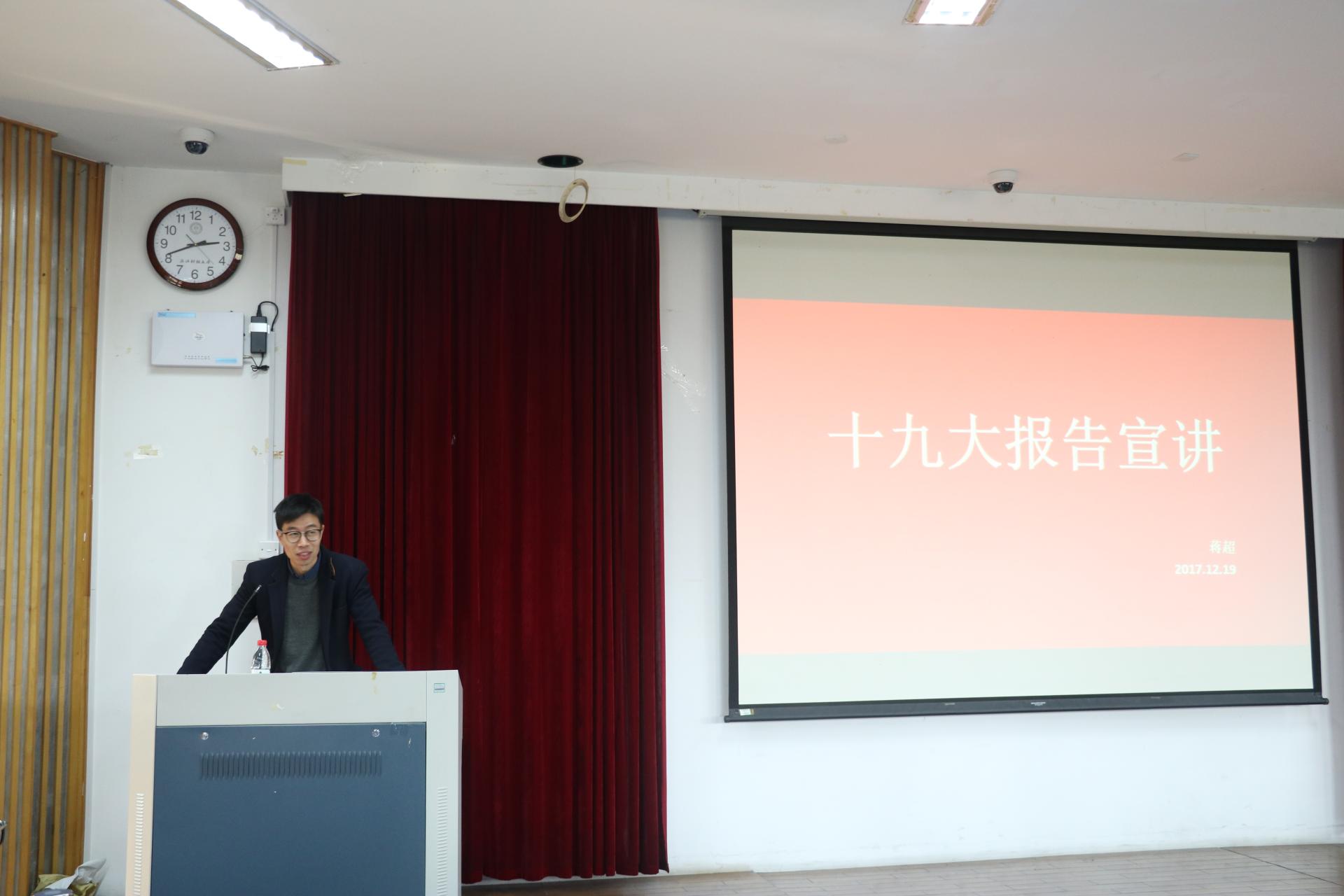 蒋超老师简单介绍了十九大的主题,列举了十九大报告中十个方面的历史性成就,并对“中国梦”和个人梦的关系进行了形象的解释。他还谈到了我国未来发展的两个重要阶段和两个重要时期,并为同学们指出十九大报告中的重要历史使命——实现中华民族伟大复兴。