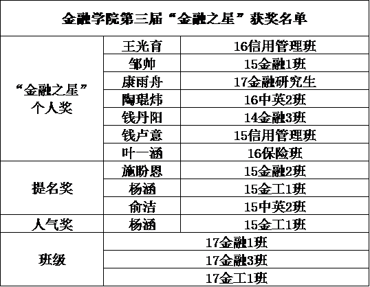 评选小组推选、线上线下投票等环节,最终产生“金融之星”个人奖7名,提名奖3名,人气奖1名,班级奖3个。