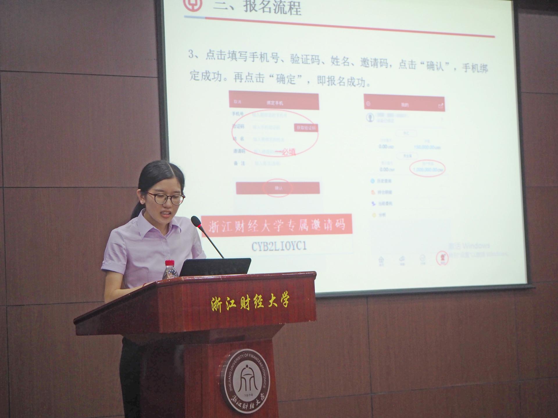 中国银行杭州经济开发区支行营业部为在场同学们详细详细解释了此次模拟交易大赛的流程及操作方式,阐明了模拟交易大赛的意义与目的。