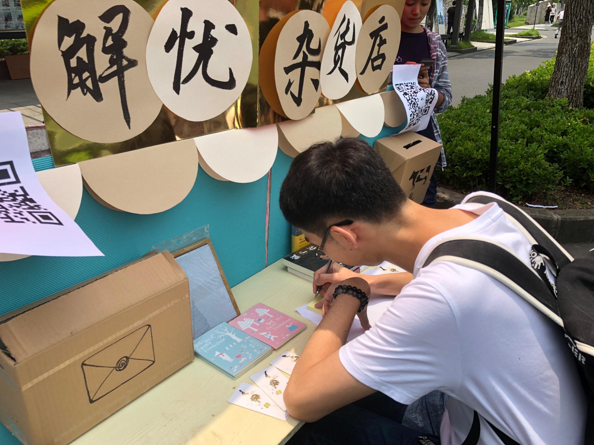 6月4日中午,在文化长廊,我们搬出了精心制作的手工摊位——一个现实版的“解忧杂货店”,同学们在“杂货店”的窗口前写下自己的烦恼,足球直播线上看