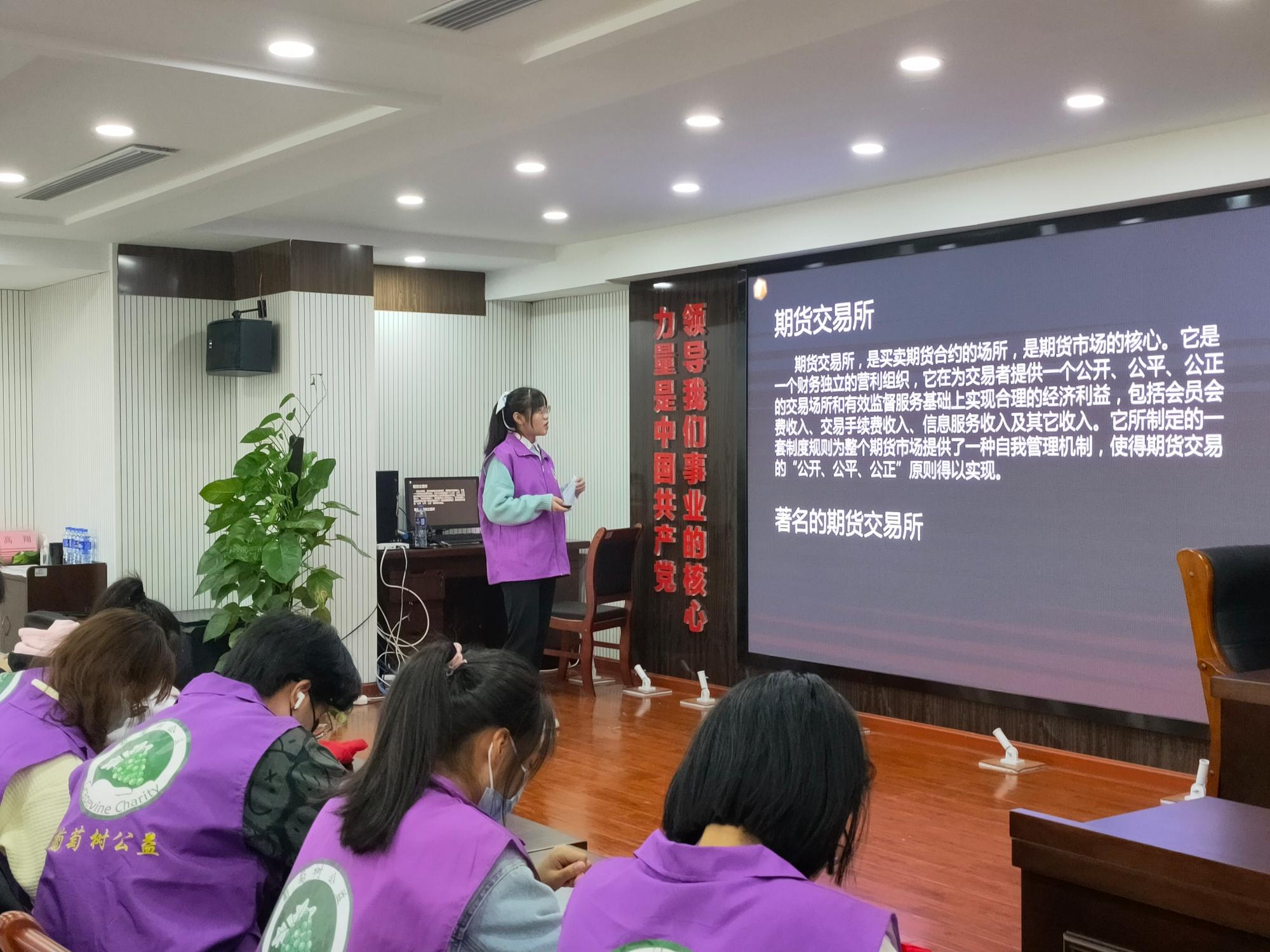 当天上午,葡萄树公益服务中心的老师对所有志愿者进行了关于志愿理念的普及和志愿者行为规范的培训,并组织志愿者们开展分组讨论。随后各小组派代表上台与大家分享了自己的志愿活动经历与感受。之后,院金融工程学会的同学为大家分享了关于金融期货的小知识,保险学会的同学为大家讲解了六险一金等保险相关知识,向现场来自不同高校不同专业的志愿者们传递了丰富的基础金融知识。