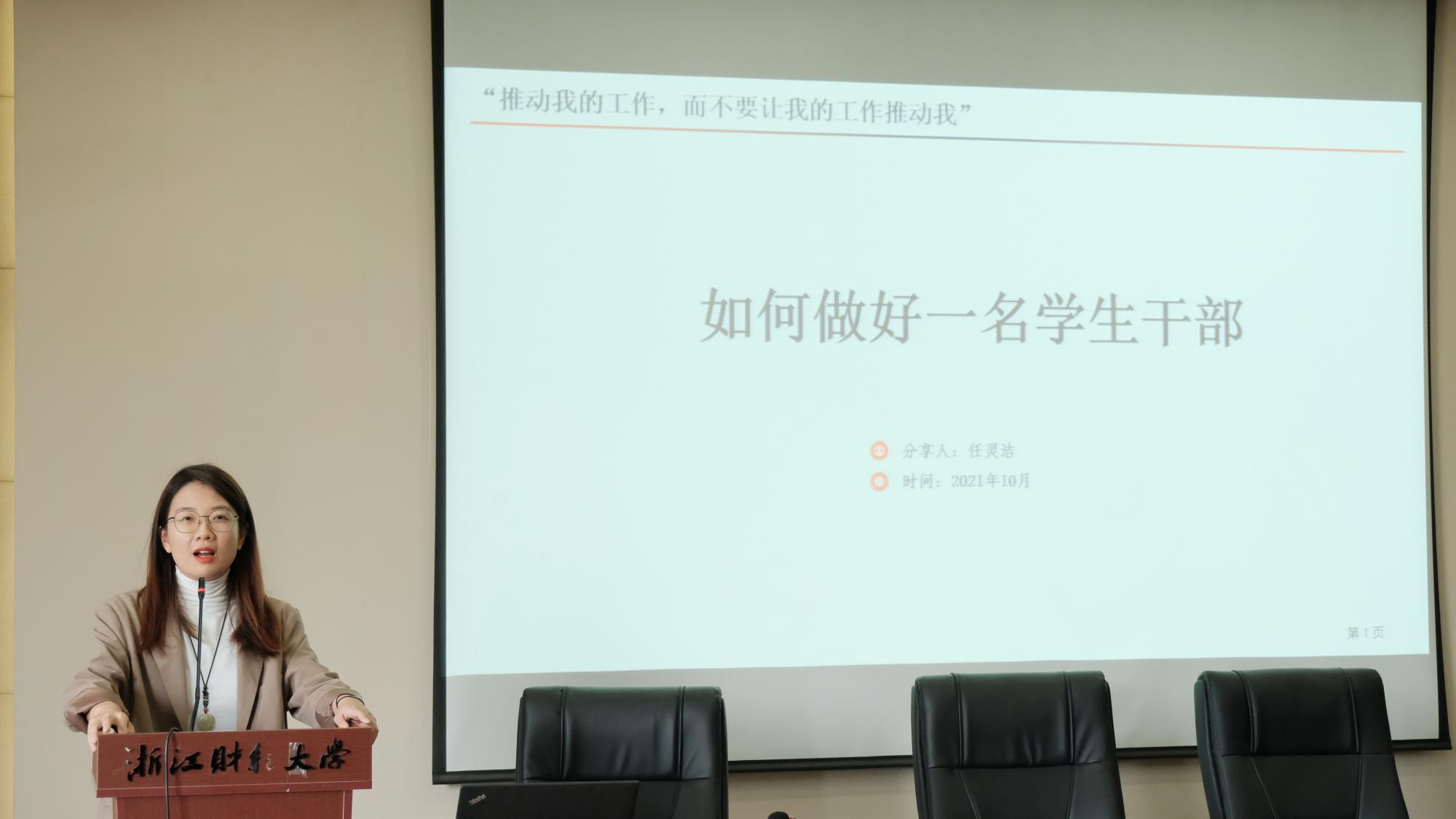 任灵洁老师以“如何做好一名学生干部”为题,通过讲述自己学生干部经历和以往优秀学生干部事例,向大家传授了“如何舒适地做一名学生干部”的经验。她强调要将“服务意识摆在第一位”,并用生动的例子阐述了“虚功实做”的工作方法,希望团干部们争取做到“一个人就是一支队伍”。