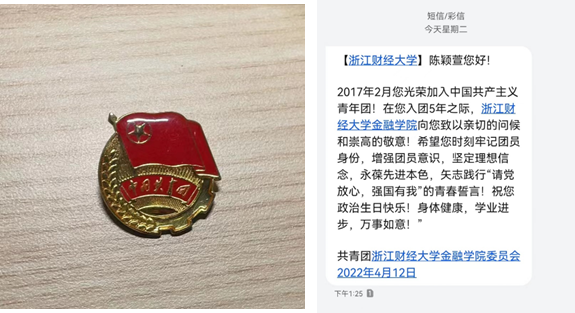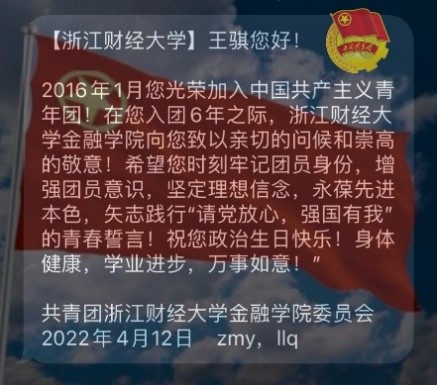 团委发送的“入团纪念日”短信。正值节日前夕,收到这条特别祝福短信,同学们深受鼓舞,也倍感温暖,纷纷晒出照片,表达着自己的热烈情感。
