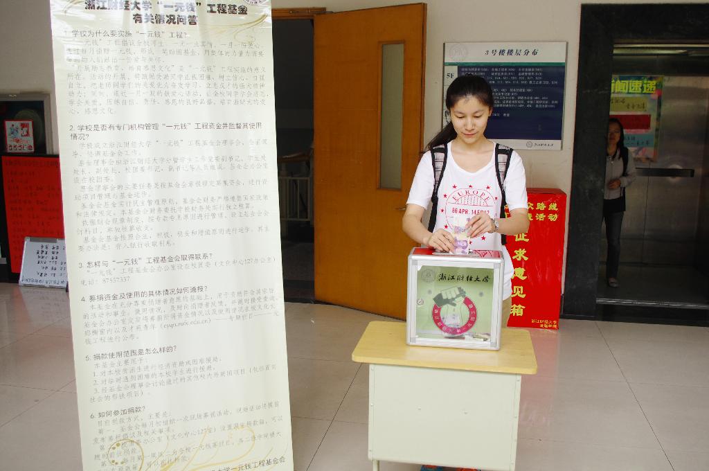 “一元钱”工程作为浙江财经大学的主题爱心活动,其目的是将我校对困难学子的帮扶、关怀的善爱精神不断发扬传承,把这份可贵的爱心播撒到每一位浙财学子身上,为浙财贫困学子实现理想、圆梦大学添上一份力所能及的绵薄之力。