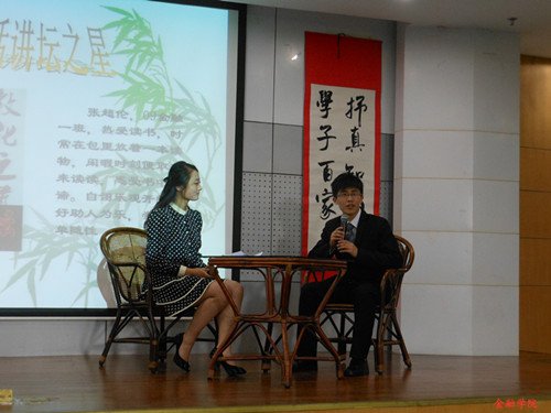 活动由对张超伦同学的一段采访拉开帷幕。主持人就“论语如何影响当代大学生的生活”、“我们如何修身”等问题请教了张超伦同学。张超伦引经据典,表达了自己独到的见解,博得了观众的热烈掌声。采访结束后,张超伦同学的演讲正式开始。本次演讲的主题是“有关阅读的思考——历史文化与生活”。他从阅读史初探,不容乐观的阅读现状与历史,革命与文化传承和读书的意义与乐趣所在四个方面表达了他对阅读的思考。此外,他还从如何挤出时间看书以及读书条目的选择给同学们提出了相应的建议,并且将近现代英国人类学家J.G费雷泽的《金枝》一书推荐给大家,分享了他独特的阅读心得。最后,张超伦同学总结了阅读对人的影响,并鼓励同学们要自我发展,探求真理与智慧,坚持信仰,洁身自好。