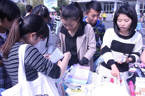 在场的同学们仔细翻看,挑选着自己需要的书籍,并不时地和一旁工作人员进行交流和咨询,表现出了对此次活动的浓厚兴趣。挑选完毕后,他们又在工作人员的指导下认真地填写资料,进行借贷登记。偶尔还有同学前来咨询,了解详细情况,工作人员也对此作了耐心周到的解答。活动紧张而有序地进行着。