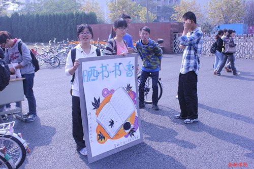 10月24日12时30分,书香传递银行晒书活动在学校西门口正式展开。一进校门就能看到显眼的宣传海报和整齐的书籍。