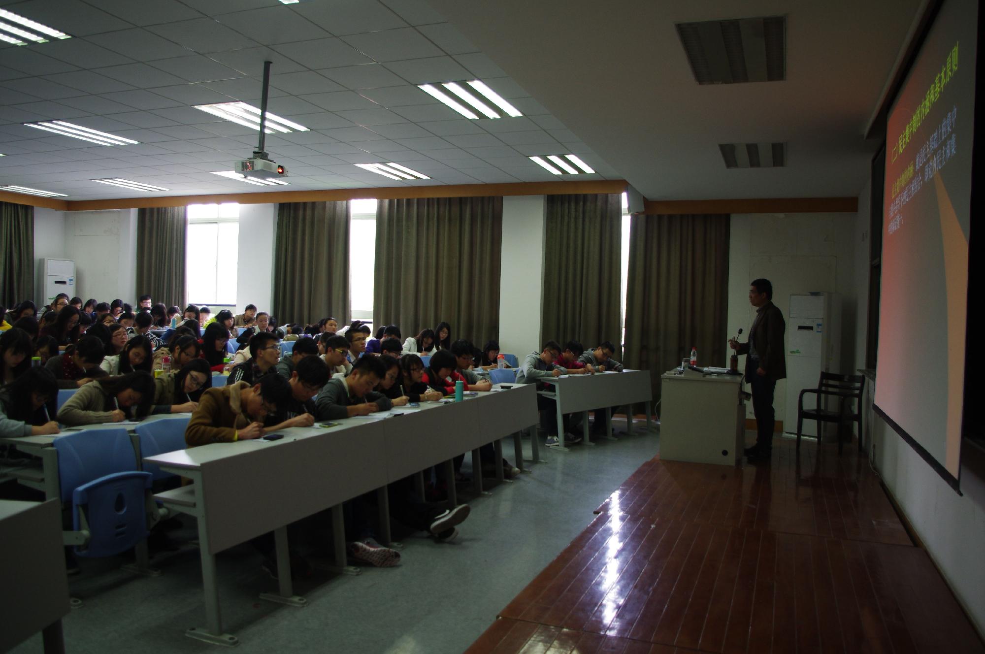 在同学们热烈的掌声中,杨鹰彪书记开始了题为“党的组织原则、党的纪律和作风建设”的党课。在介绍党的组织原则时,杨书记着重强调了民主集中制作为党的根本组织原则的重要性,同时详细介绍了民主集中制的内涵和基本原则。在党的纪律方面,杨书记介绍了党的七大纪律即政治纪律、组织纪律、宣传纪律、群众纪律、财经纪律、外事纪律、保密纪律,点明了党的纪律对更好地发展全党事业的重要性,同时强调作为党的接班人,我们应该努力做遵守纪律的规范模范。在党风建设方面,杨书记首先解释了党风的涵义以及群体性和稳定性两大特性,随后具体详尽地介绍了党的优良作风的基本内容:理论联系实际的作风、密切联系群众的作风、批评与自我批评的作风、艰苦奋斗的作风。杨书记列举了前苏联的例子来强调加强和改进党风建设的重要性,他指出党的作风关系到党的形象和威信,决定党事业的成败、影响党的前途和命运。结合当前的社会实际,杨书记重点强调了腐败问题,他指出了腐败对全党事业发展的危害性,向同学们介绍了今年全党在反腐败方面所做的努力以及取得的成就。杨鹰彪书记用简洁明了的语言、生动鲜活的例子向同学们介绍了党的组织原则、纪律以及作风建设。台下的同学们也聚精会神地听讲、认真地做着笔记。