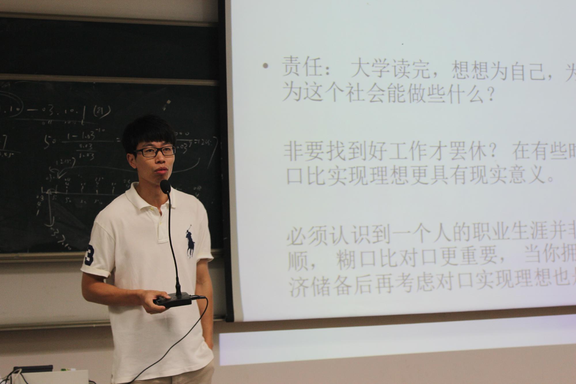 的辅导员蒋超老师主讲。到场的大四学生们认真倾听,时时记录,反响热烈,并对今后的就业工作都有了一定了解。