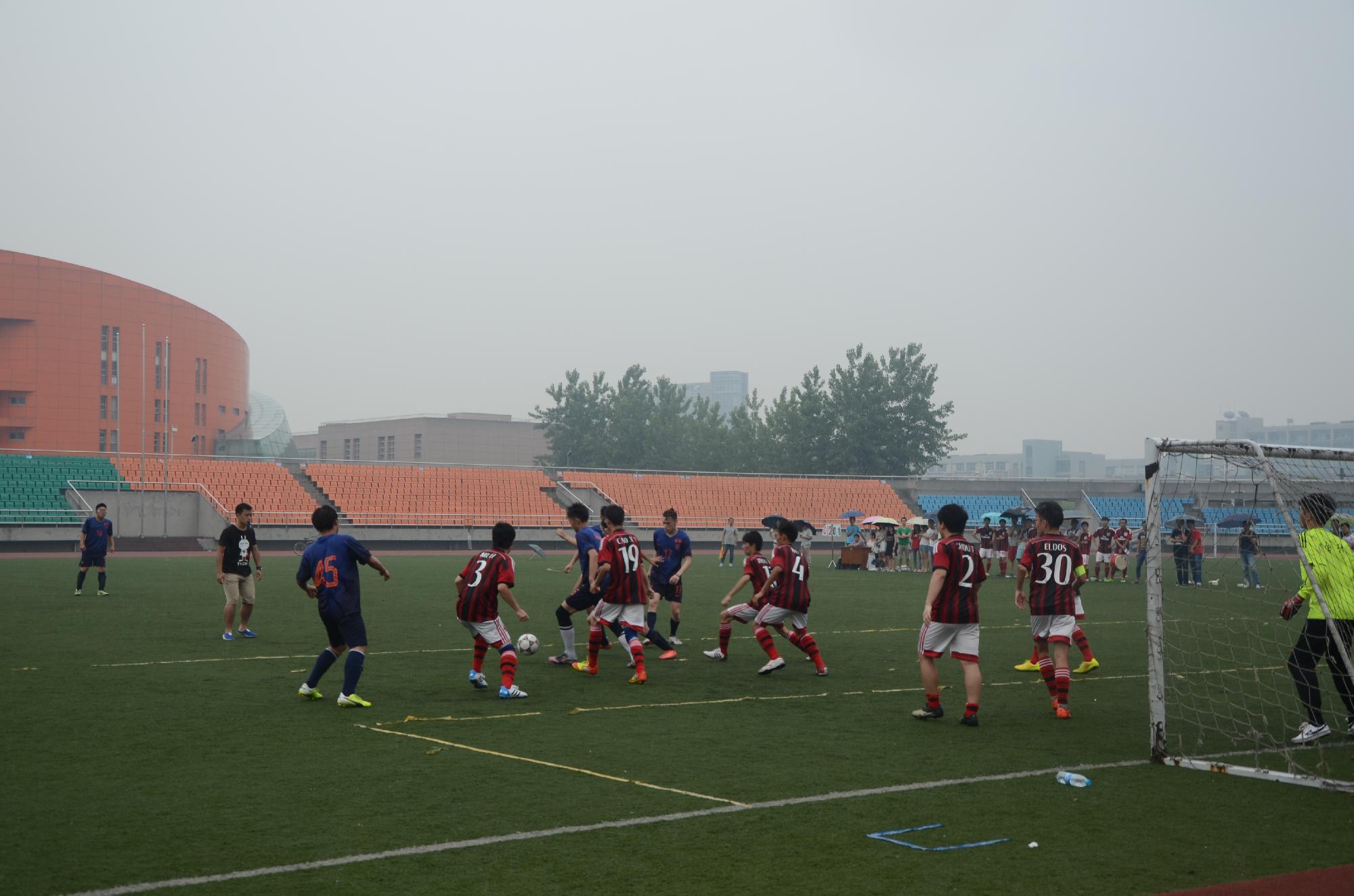 队员丝毫不气馁,防守依然章法有序。场外的观众也打鼓呐喊为金融加油助威。比赛的时间逐渐流逝,雨势也渐渐加大。但线上看足球