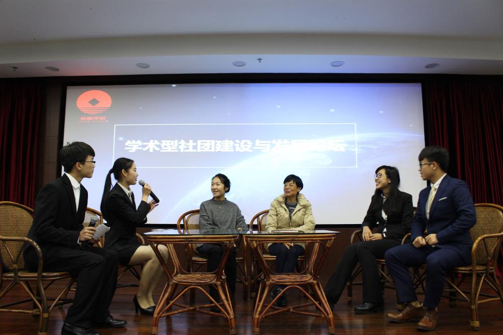 在随后的论坛环节中,国际金融学会专业指导老师徐敏进行发言,她首先介绍了各学会的发展过程,随后呼吁同学们积极参与到各学会的活动中,为建设学术型社团添砖加瓦。在最后的访谈环节,各学会指导老师以及会长代表就双导师制优点和学科竞赛对于学术型社团的建设意义、“APEC”计划对社团发展作用、如何进行社团资源配置整合和平台建设四大问题进行解答,现场气氛十分活跃。