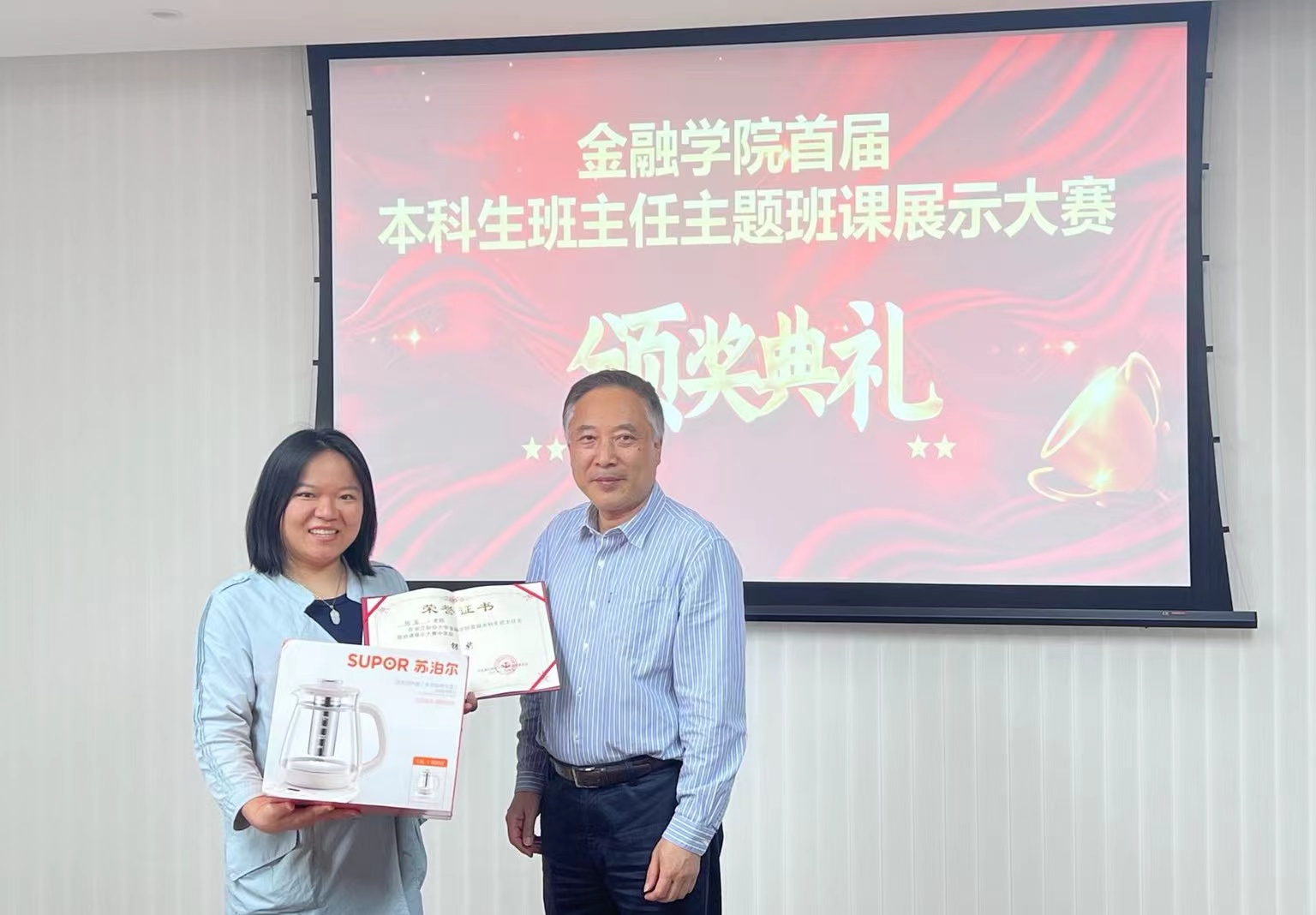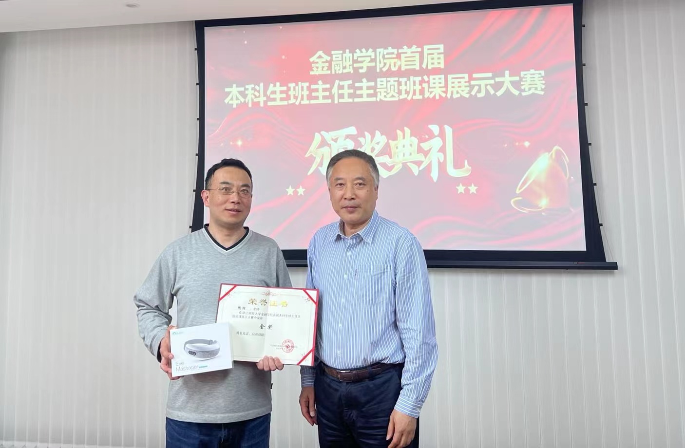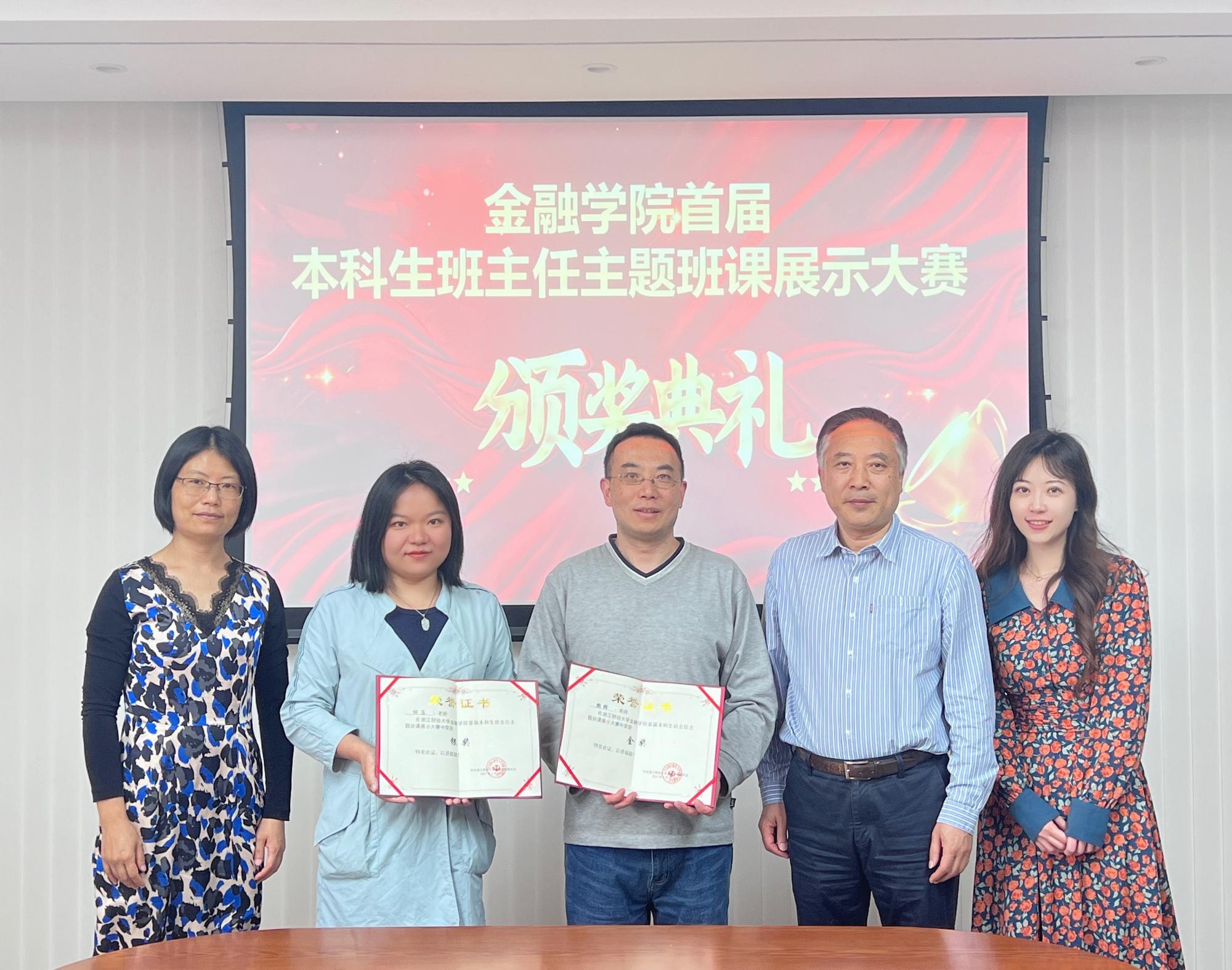 党委书记蔡国金为两位获奖老师颁奖,并合影留念。