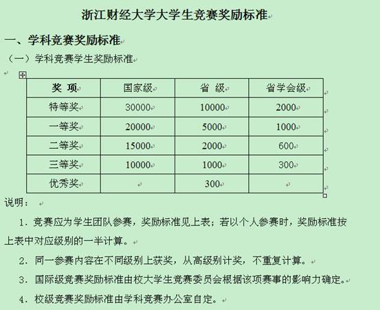 举办的省级A类学科竞赛,根据《浙江财经大学大学生竞赛管理试行办法》浙财大[2006]28号,指导老师带队参赛奖励标准如下:特等奖10000元、一等奖5000元、二等奖2000元、三等奖1000元、优秀奖300元。竞赛应为学生团队参赛,若以个人参赛时,奖励标准按上述对应级别的一半计算。请各位老师积极组织学生报名参赛。