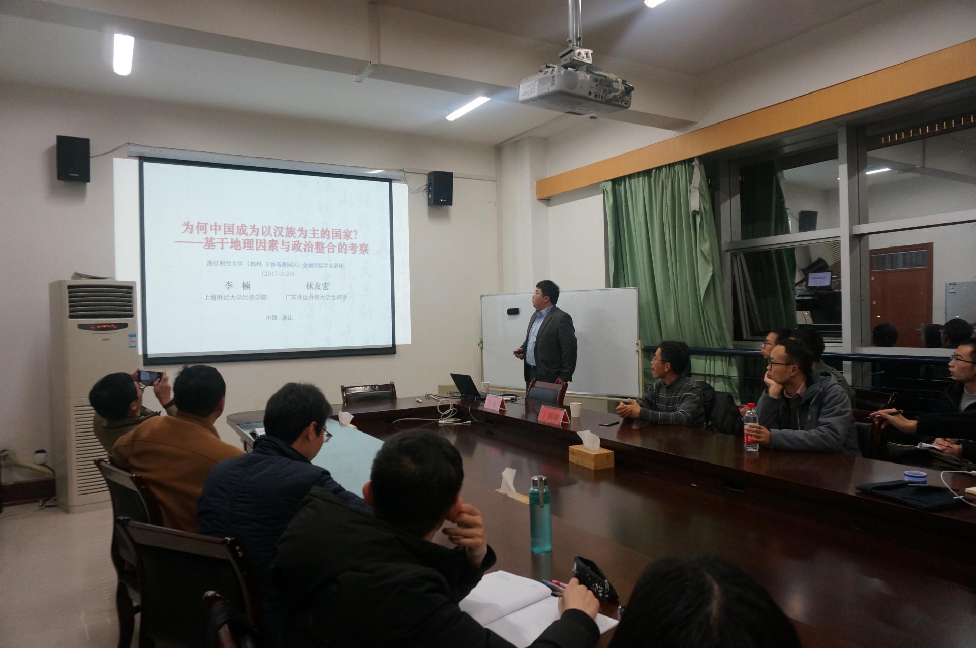 经济史副教授、上海财经大学讲席副教授、博士生导师李楠应邀作了题为“中国如何成为以汉族为主体的国家?基于地理环境与政治整合的考察”的学术报告。本次报告由浙江财经大学丁骋骋教授主持,足球直播线上看