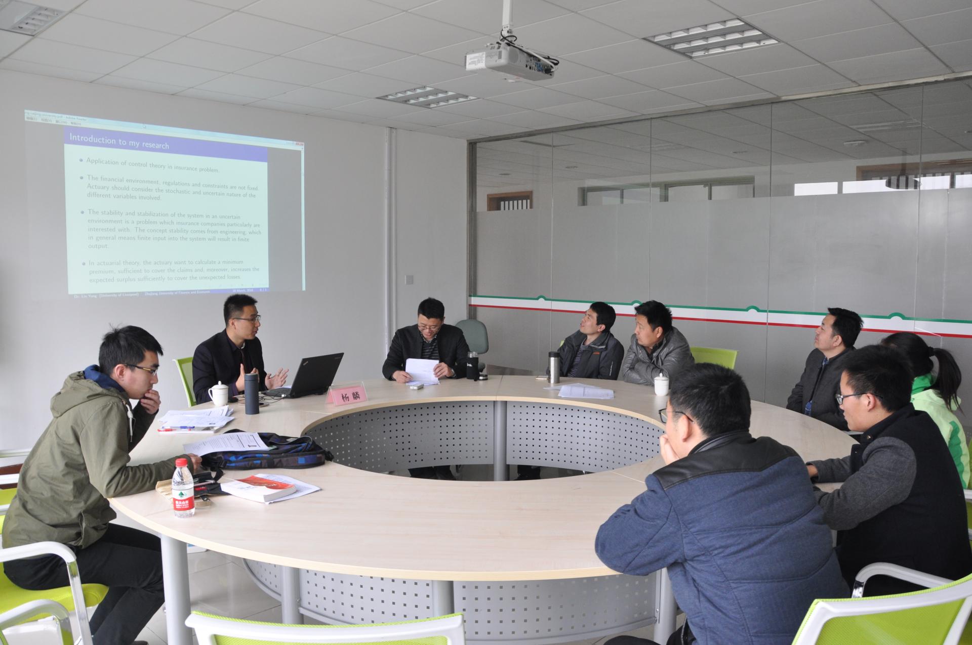 3月30日上午,英国利物浦大学杨麟博士应邀来我校讲学,就其博士论文“控制论在非寿险保费-储备金盈余系统进程中的应用”与师生们作了精彩的分享,会议由金融工程系主任王聪聪副教授主持,足球直播线上看