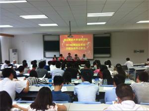 楼102教室举行了2014级研究生新生专业介绍及硕导见面会。本次会议邀请了杨鹰彪书记、夏红芳副院长、陈荣达副院长、院长助理朴哲范和保险系主任叶晓凌等领导,以及足球直播线上看