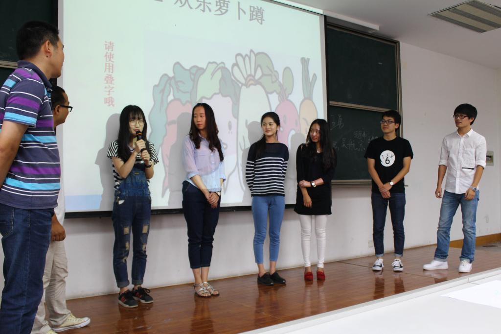接下来便进入互动环节。第三个环节是一个游戏,大家开始互动起来,参加活动的同学上台先介绍一下自己,让更多的同学认识自己。新生刘鑫龙给大家带来一首《流星恒星》,情真意切,打动全场。第四个环节大家又开始游戏互动,“欢乐报数字”的游戏让大家对新同学有了很多的了解。第五个环节是新生张茜茜给大家带来的一段热舞——《PARTY》,点燃全场,博得阵阵喝彩。接下来的环节我们开始了“吃西瓜大比拼”,14级学长陈文俊也积极参与进来和新生打成一片,这个比赛中各组之间不但团结配合而且带动了全场的气氛,大家都为各自组的比赛成员鼓掌加油。最后,15级新生杜和佳给大家带来了歌曲《后会无期》,将大家带人一个安静柔和的气氛之中。
