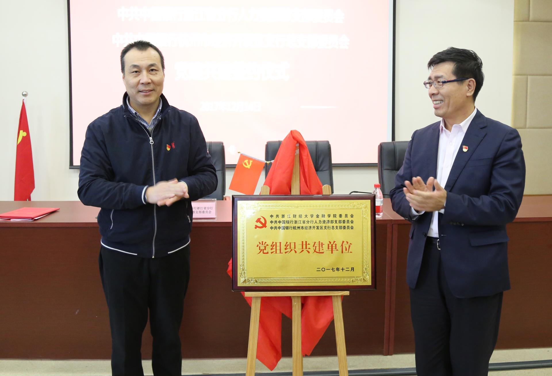 中国银行浙江省分行人力资源部支部委员徐海燕宣读了党组织共建实施方案,在热烈的掌声中,三方代表共同签订共建协议书,李金昌书记和李楠书记为共建牌匾揭牌。随后李金昌书记向李楠书记颁发了浙江财经大学党校特聘教师证书。