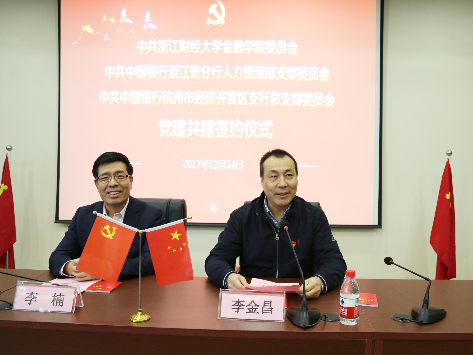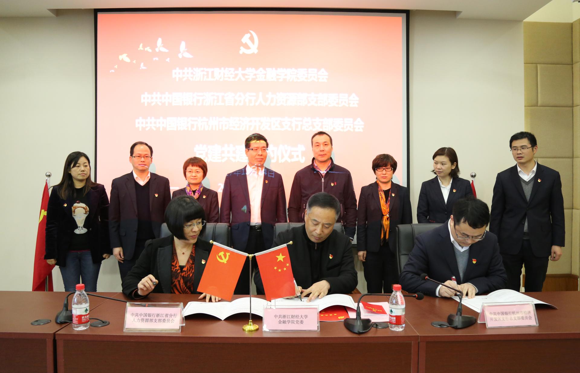 12月14日下午,足球直播线上看 党委与中共中国银行浙江省分行人力资源部支部委员会、中共中国银行杭州市经济开发区支行总支部委员会党组织共建签约仪式在足球直播线上看 楼202报告厅隆重举行。浙江财经大学校党委书记李金昌、中国银行浙江省分行纪委书记李楠、中国银行浙江省分行人力资源部支部书记、总经理朱丽娟、中国银行杭州经济开发区支行党总支书记、行长张若平、足球直播线上看 院长陈荣达、足球直播线上看 党委书记蔡国金等出席仪式。仪式由足球直播线上看 院党委副书记叶秀主持。