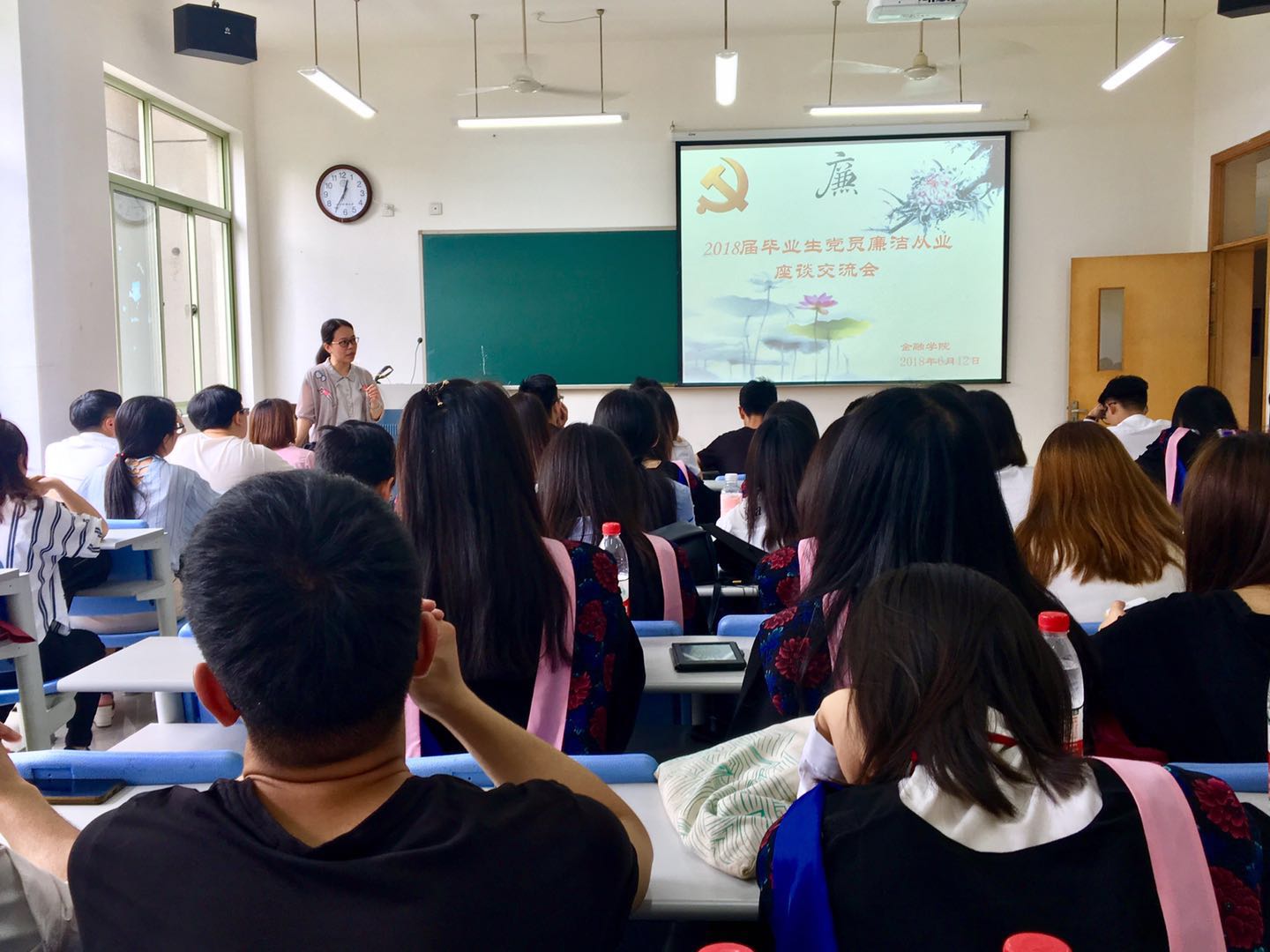 6月11日中午12:30,足球直播线上看 在3号楼101教室召开2018届毕业生党员廉洁从业教育座谈会。足球直播线上看 党委副书记叶秀出席会议,辅导员聂亚平及全体毕业生党员参加会议。