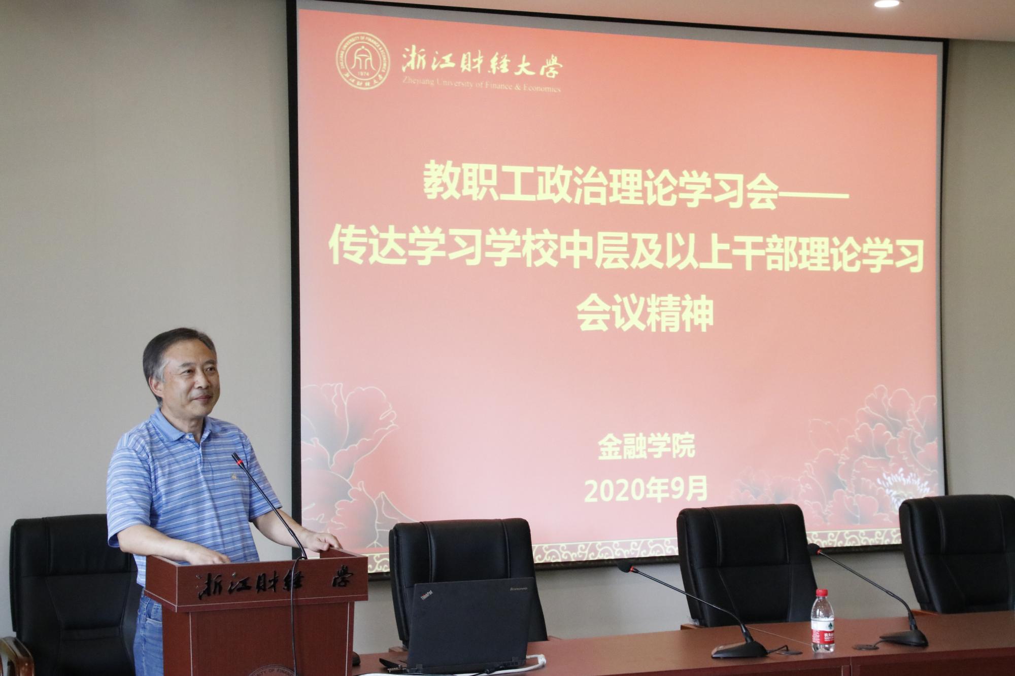 随后,蔡国金传达学习了校党委书记李金昌、校长钟晓敏在中层及以上干部理论学习会上的讲话精神,强调面对国际大变局对高等教育的新挑战、我省“重要窗口”建设对高等教育的新要求、学校高水平财经大学建设的新任务,要深入学习贯彻习近平总书记在浙江考察时重要讲话精神,全面落实高教强省发展战略,进一步加强党的政治建设,紧扣立德树人根本任务,谋划学校未来建设发展思路,迎接第二次党代会召开。