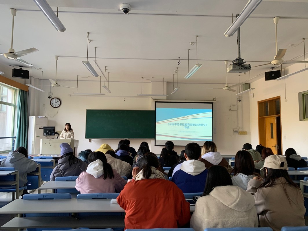 支部书记沈晓云首先对《习近平总书记教育重要论述讲义》的时代背景和科学内涵做了阐释。她提到,党的十八大以来,习近平总书记就教育改革作出了一系列重要讲话、指示批示,提出了一系列新理念、新思想、新观点,形成了习近平总书记教育重要论述,重要论述从根本上阐明了新时代中国特色社会主义教育发展方向、道路、方针、原则等一系列方向性、根本性、战略性问题,为加快推进教育现代化、建设教育强国、办好人民满意的教育提供了根本遵循和行动指南。同时,她还围绕《讲义》导言和九个专题进行导读,倡议支部全体成员牢记总书记嘱托,肩负时代责任,高扬理想风帆,静下心来刻苦学习,努力练好人生和事业的基本功,真正做到在思想上有高度,在专业上有深度,在生活中有温度,在情感中有热度的新“四有”青年人。
