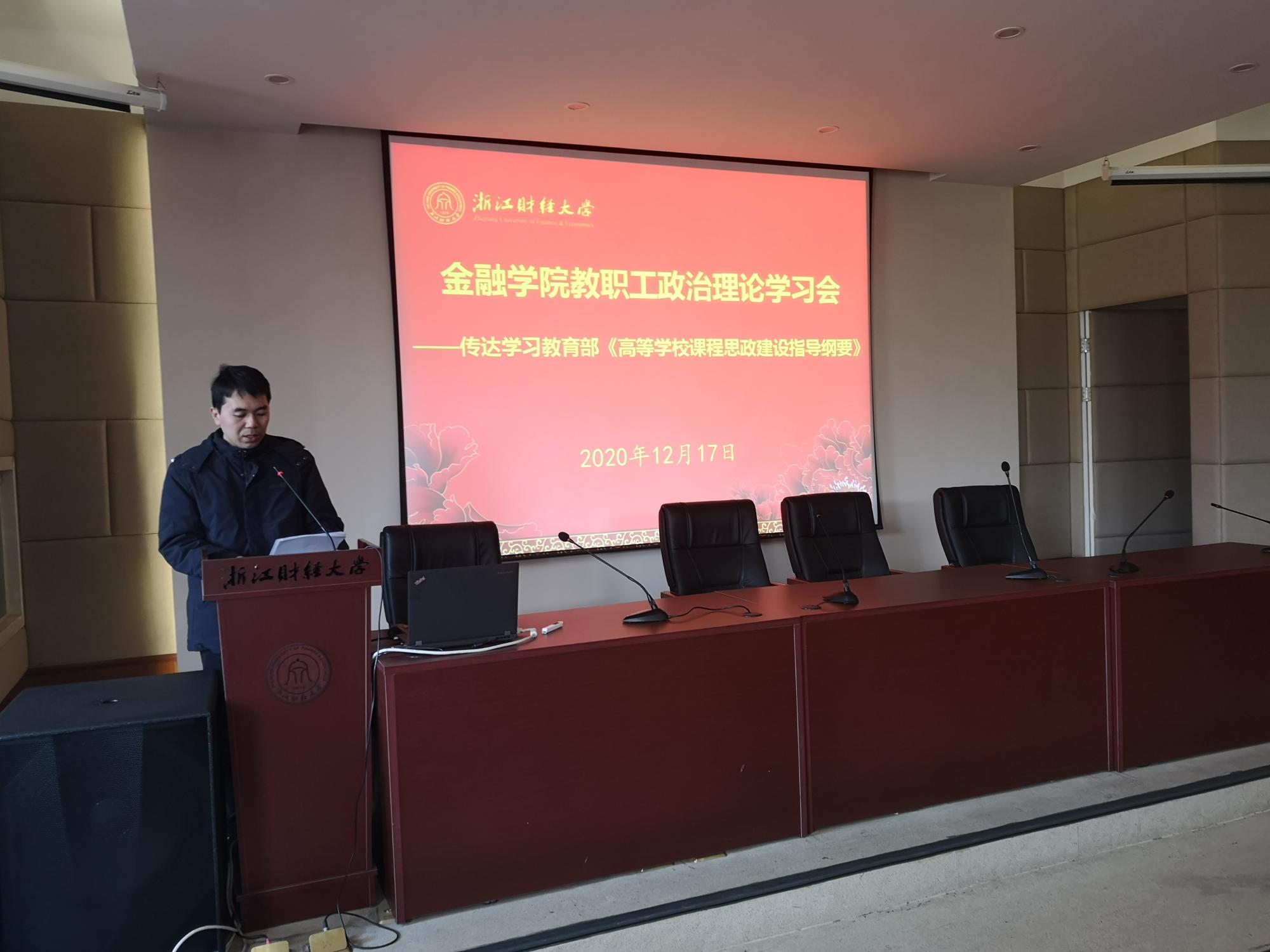 傅俊辉传达了教育部《高等学校课程思政建设指导纲要》的重要精神和内容,对纲要出台的背景和重要意义、全面推进高校课程思政建设的工作目标、工作思路、构建课程思政内容体系、教学体系、抓好课堂教学建设、提高教师课程思政建设意识和能力、推进课程思政建设工作落实等方面进行了深入解读。他指出,要科学设计课程思政教学体系、立足金融学科的专业特点推进课程思政建设、推动课程思政全程融入课堂教学建设、着力提升专业教师的课程思政建设能力、完善课程思政建设评价激励机制,将思政教育融入专业建设和课堂教学全过程。