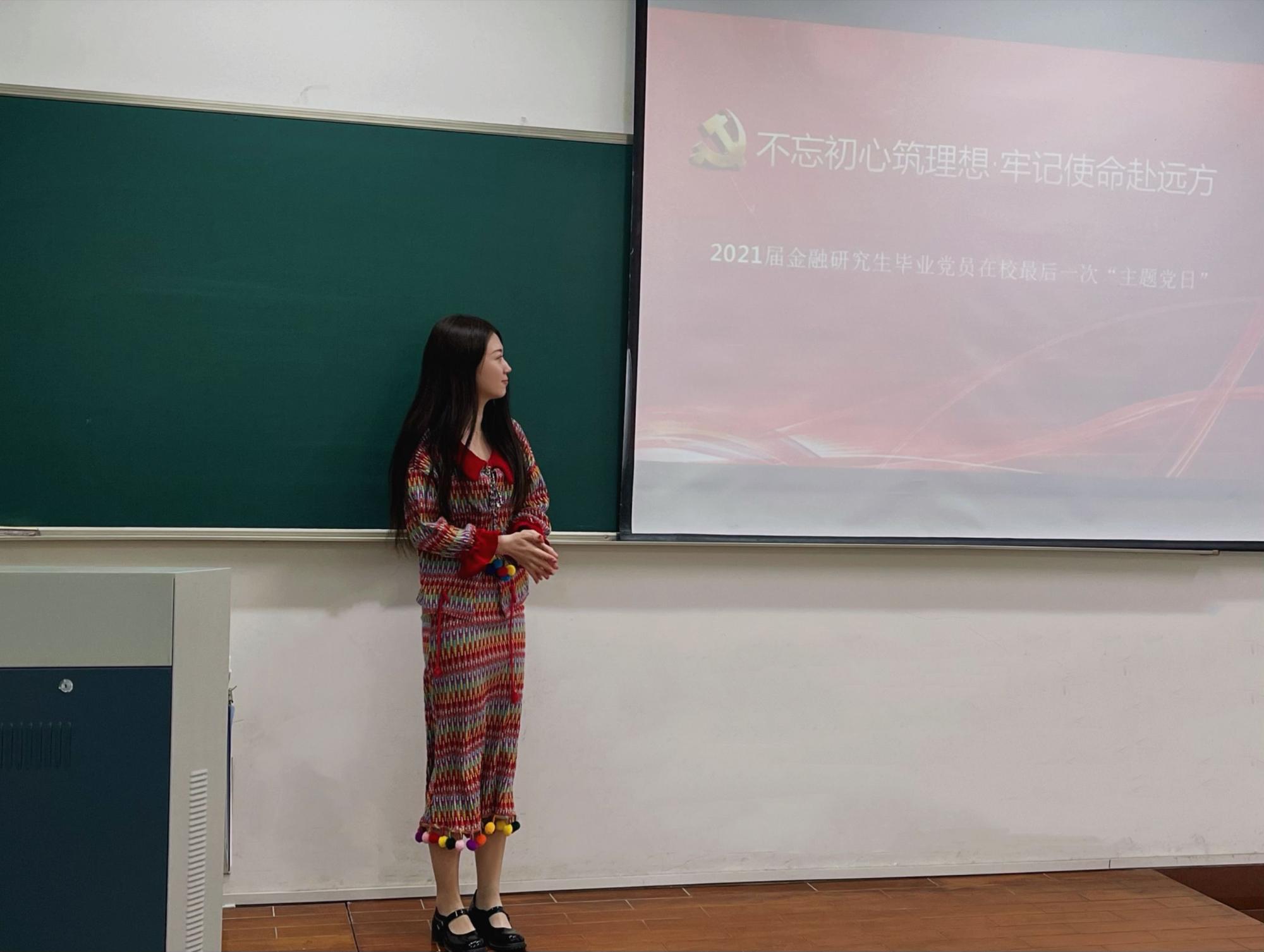 党建指导老师谢琳以“不忘初心筑理想·牢记使命赴远方”为主题,为全体毕业生党员上了最后一堂党课。她寄语毕业生党员们走上工作岗位后,要牢记共产党员的光荣身份,作为一名浙财人,要始终牢记母校校训、发扬足球直播线上看