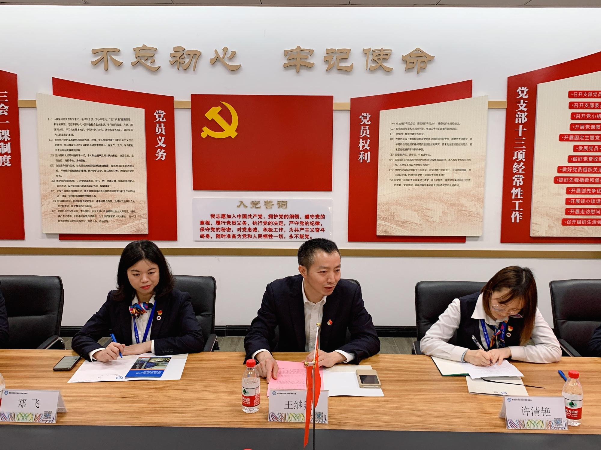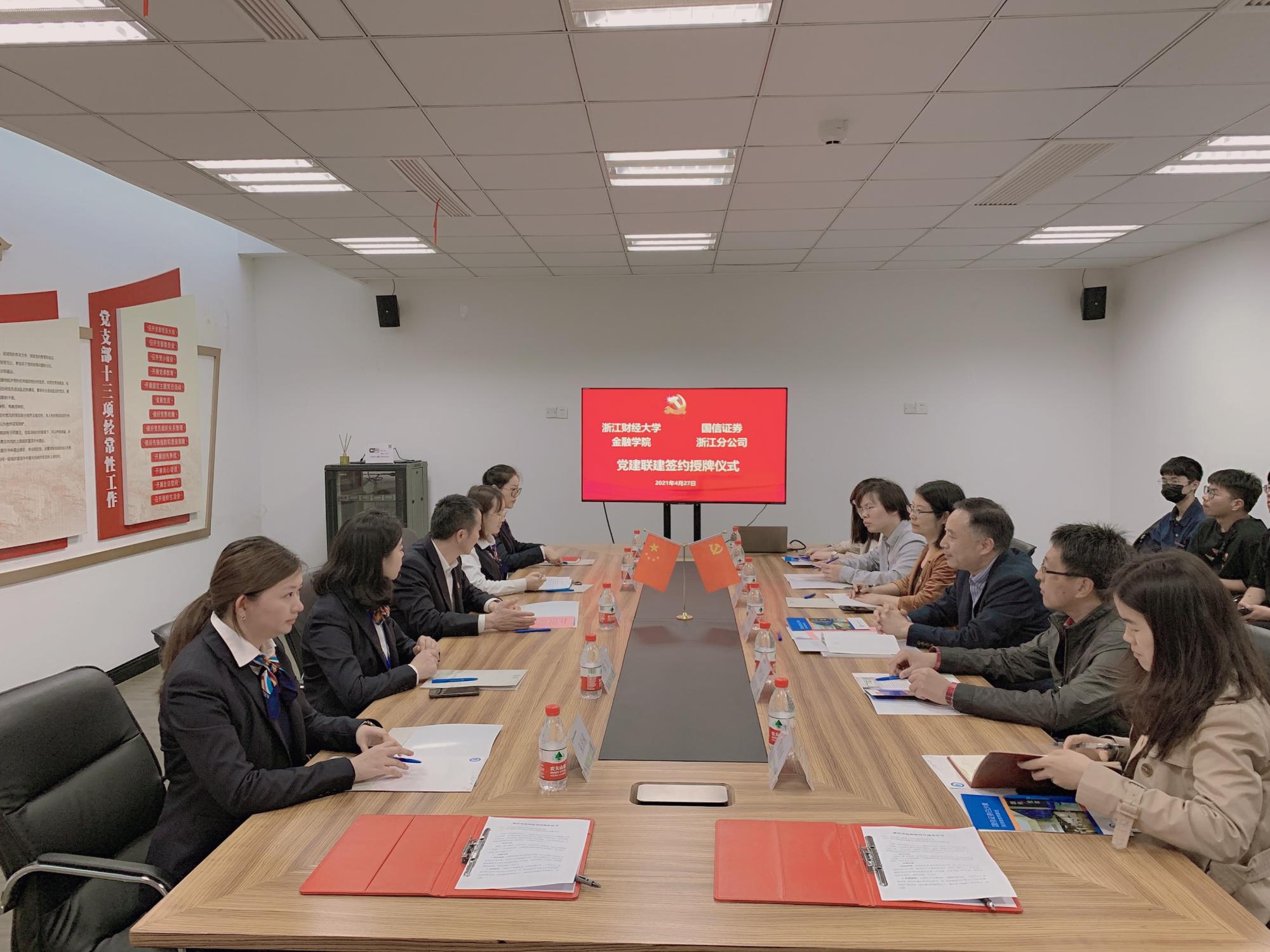党委与国信证券浙江分公司党委在国信证券白沙泉投资者教育基地举行党建共建签约仪式。国信证券浙江分公司党委副书记王继翔,党委委员、第一党支部书记、党群办公室主任许清艳,第二党支部书记、直属业务二部总经理助理郑飞,足球直播线上看